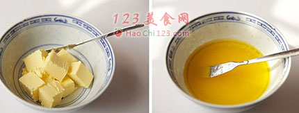 3、黄油放在碗内隔水加热至溶化备用。