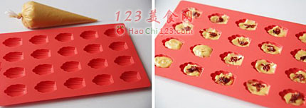 5、将面糊装入裱花袋内,在乐葵模具里挤上入三分之一的面糊,中间加入玫瑰花馅,再挤上另一半的面糊。