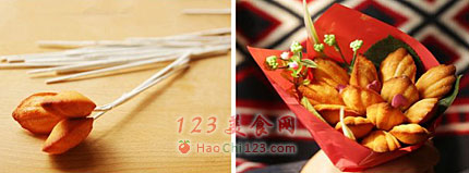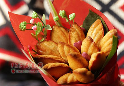 7、把玛德琳装饰在铝线上,用装饰胶片固定好,一层一层围成花束,用清洗干净的新鲜玫瑰叶与红色油纸包成花束状即可。