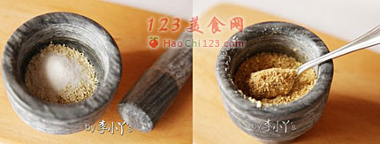 3、芝麻用烤箱焙熟或者平底锅小火炒香,芝麻、盐、五香粉一起放入石臼里捣碎即成五香芝麻盐,备用。