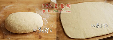 4、发酵好的面包取出揉至表面光滑,用擀面仗擀成略长方型的大面片儿。