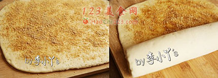 5、面片上刷上一层香油,然后均匀的撒上五香芝麻盐,把面片儿横向卷起,收口。