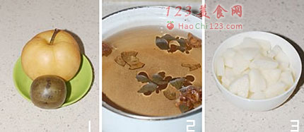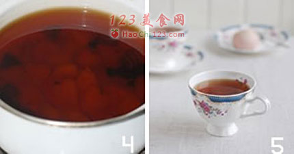 4、锅内水煮至深色时加入梨再煮5分钟左右即可(也可以直接用开水泡,但煮的药性散发的更好,一次用三分之一的罗汉果,煮出的水颜色就很深了,不用另外加糖,罗汉果本身有甜味。梨晚些加入,可以保证良好的口感,煮太烂就不好吃了)。
