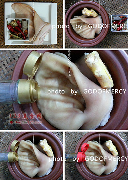 5、倒入干红辣椒、生姜等卤料,加进老抽上色。1勺料酒那是必须的。放入1勺白糖。加进1勺精盐。炖锅里放入水量与猪耳朵平行,可以适量的加入老卤水。开盖煮沸后,盖锅盖小火煮40分钟,再关火焖3小时以上。