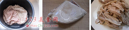 3、切成条备用(我实在说不清楚这东西是切丝还是切条儿了,总之这个吧宽和厚差不多看起来像条儿,切薄了又是片儿,叫法么又叫丝,太混乱了)。