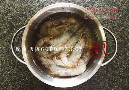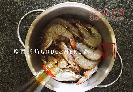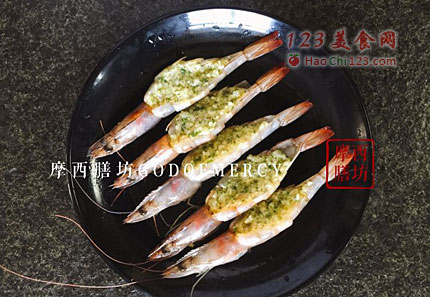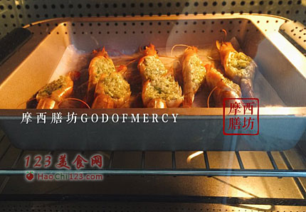 7、把腌制好的白虾一个个平铺在烤盘上,不要相互叠在一块。烤箱预热,放入白虾180度烤15分钟即可。