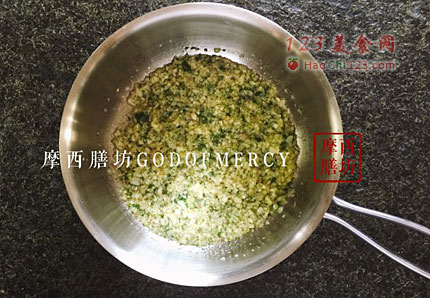 1、烤虾的馅料,以一个大蒜、一个小洋葱和薄荷加起来的量,来决定鸡扒的多少,各占一半即可。