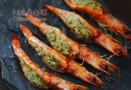 3、刚炒好的馅料会有一些沫子,稍微放凉了之后,等沫子没有了,再涂抹在虾肉上。涂抹要均匀,这样黄油和馅料的独特味道才会渗透到虾肉的每一处。