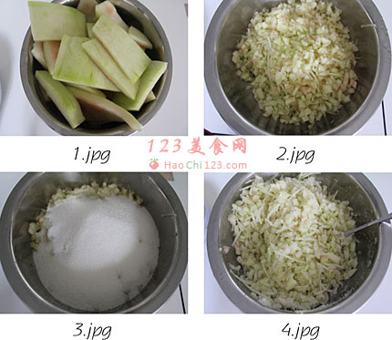 4、把砂糖和瓜皮丁搅拌均匀,腌1个小时左右,腌至出水。