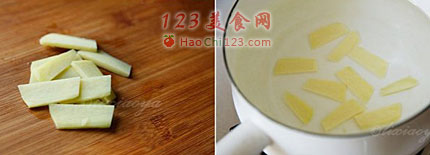 2、锅内注入水,放入姜片煮开。