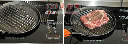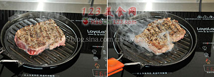7、一面煎烤3-4分钟就可以翻面了,用这个烤盘有一个好处,就是煎出的牛排纹路很漂亮。