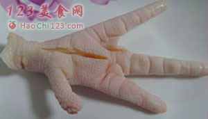 2、解冻后,将凤爪洗净,去掉尖尖的爪子,在脚掌上划一道(这样容易入味)。