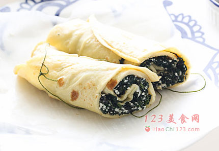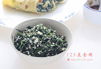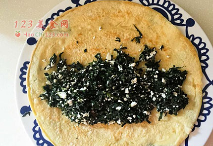 7、煎饼放入盘中,放入扫帚菜,蒜汁。