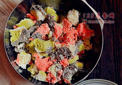3、加入五香粉,加入白胡椒粉和盐,放入浸泡好的馒头,用手抓均匀。