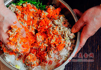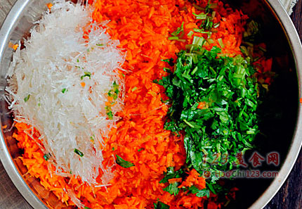 2、胡萝卜擦成丝剁碎,香菜切末,粉丝剁碎备用。
