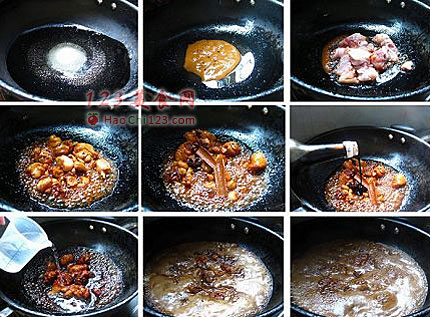 3、锅中座油,下糖炒出糖色,倒入剁好的鸡腿翻炒片刻。