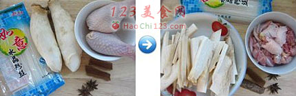 2、鸡腿菇洗净切片、八角两个、桂皮两小枝洗净备用。