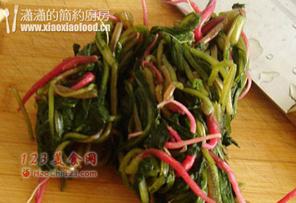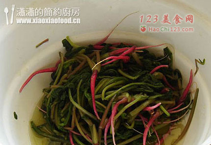 4、萝卜菜腌过,所以再调味的时候一定要注意盐的用量,没有信心的时候可以捏一点萝卜菜尝尝味道再放盐,如果前面放得太多了,建议炒的时候就不要再放盐了。