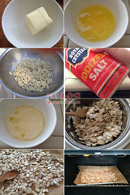 二、炒南瓜子:1、黄油用微波炉融化,加入盐混好。