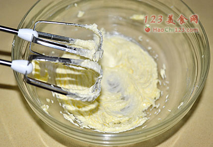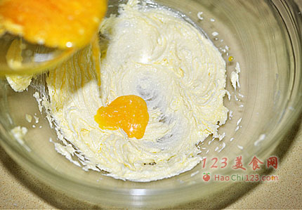 3、蛋黄打散,少量多次地加入到黄油中,每次加入都需搅打充分至完全融合。