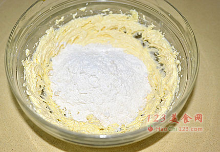 4、低筋面粉过筛后与杏仁粉混合均匀,一起加入到黄油糊中。