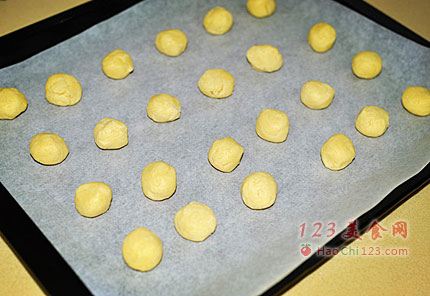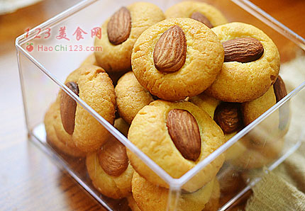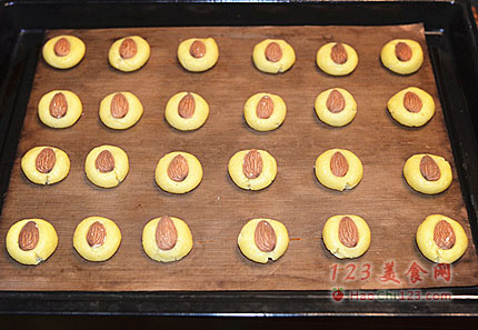7、将大杏仁放在面团的中间,轻轻往下按,让杏仁粘在面团上,放入预热好180度的烤箱中上层烤15分钟左右即可。