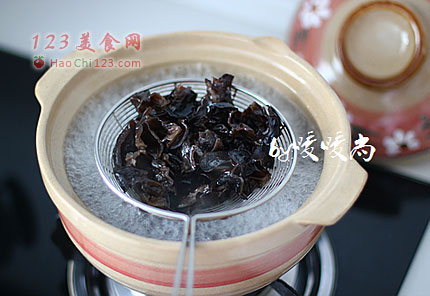 4、开一锅水,下处理后的木耳焯水1-2分钟,然后捞出用冰水冰一下,控水备用。