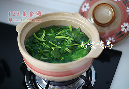 5、往焯木耳的水里加一点盐和几滴食用油,烧开后下菠菜段,汆烫半分钟,然后捞出冲凉后攥干水分备用。