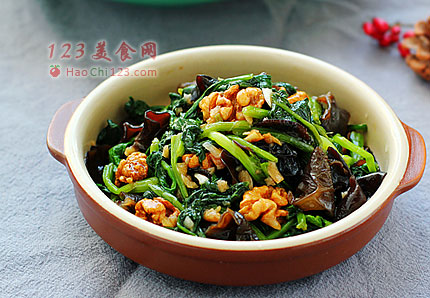 6、取一大碗,将木耳、菠菜、核桃仁和料汁混混拌匀即可。