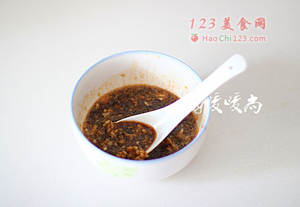 2、大蒜切片,加一点点盐(分量外,最多0.5g)捣成蒜蓉。然后调入陈醋、酱油、盐、白糖和香油调匀作为料汁。