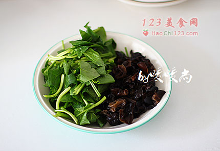 3、菠菜洗净后切成寸段,木耳提前泡发后,洗净去蒂撕成小朵。
