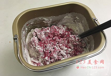 3、将面包材料(除黄油之外)的放入面包桶内。用筷子搅拌至无干粉状态(机器搅拌时干粉容易飞溅,所以先用筷子搅拌下)。