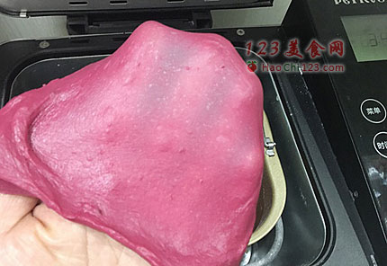 4、启动面包机imix功能(搅拌冰激凌),20分钟后,加入软化的黄油丁,再次工作一个imix程序,20分钟(用这个程序揉面,250克的话,30分钟即可,我这个大点,就用40分钟),揉好的面团,可以拉出大片的薄膜。