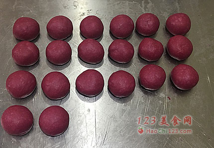 6、将发酵好的面团取出,擀压排气,分割成每个约48克的面团,共20个(我用的是原料的翻倍量,记着点哈)。将面团滚圆,盖保鲜膜松弛15分钟。