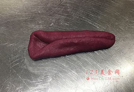 7、取一个面团,擀成倒三角的形状。如图,折叠,翻过来松弛15分钟。