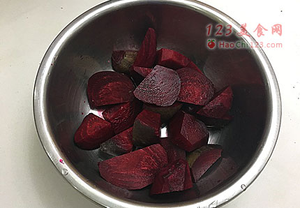 2、将甜菜放入美的原汁机中,开启机器,榨汁(一边出渣,一边出汁,先不开口,让它多转会),打开出汁口,接出甜菜汁。