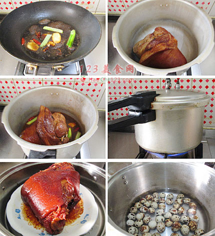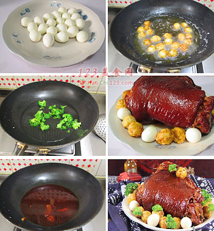 22、蒸好的肘子放入盘中,炸好的鹌鹑蛋围在肘子边上。