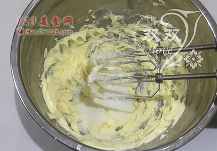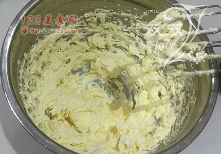 2、搅打好的黄油颜色发白,体积膨大,纹路清晰。分次加入蛋液,搅打均匀。打发好的黄油。
