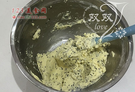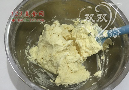 3、筛入低筋面粉。刮拌至无干粉状态。