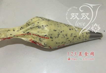 5、将面糊装入裱花袋内(裱花袋剪口,装入大号8齿花嘴)。