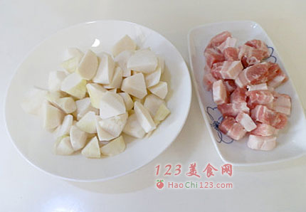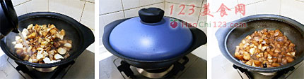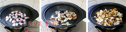 2、五花肉入锅前最好在锅内放少许油,因为这道菜五花肉切的块儿不是很大,如果不放油的话短时间内出油少,瘦肉部分会柴掉,不像红烧肉一样切麻将块儿大小的出油量会很大。[LaoYanHuo.com]
