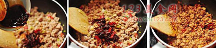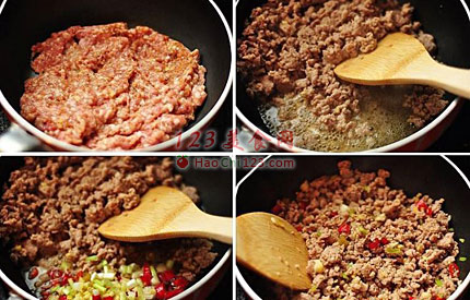 2、锅中不放油,下肉末,翻炒出肉汁和少许油脂,将肉末拨到一侧,下葱姜蒜辣椒碎等香料,炒出香味后和肉末翻炒均匀。