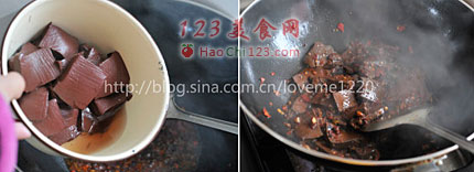 7、制作起来很简单,因为放入了三种辣椒酱所以猪血一点儿异味没有,反而很香。我觉得猪血和辣椒是很好的搭配。[LaoYanHuo.com]