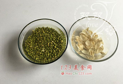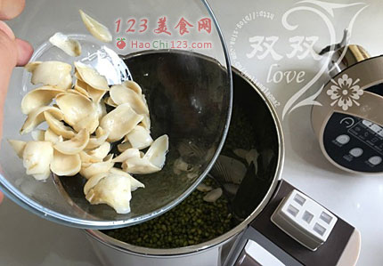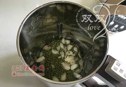 2、将泡发好的绿豆、百合放入豆浆机中。