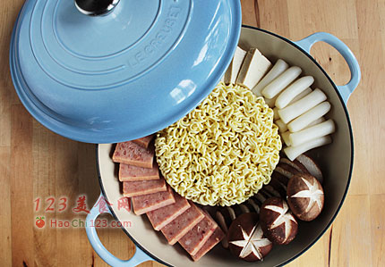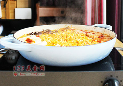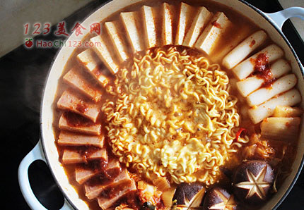 贴士:部队锅是韩国一种火锅,用香肠、午餐肉、年糕等食材为主料,加入韩式辣酱和汤底,制作出的火锅。在部队锅中加入耐煮的辛拉面或者乌冬面,吸饱了汤汁的面条,绝对是部队锅中的主角。被汤汁咕嘟咕嘟着,每一口都是满足。食材可以根据喜好变化,替换成香肠、彩椒、蒿子秆都可以呦。[LaoYanHuo.com]