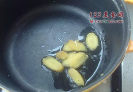 2、锅底加油,加热炒姜。