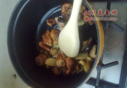 4、炒香后加入水,将所有原料放入锅中,加入调料调味。大火烧开水后,改用小火炖制,大概一个半小时。