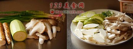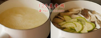 2、锅内注入高汤,加入山药片煮熟,加入蘑菇和节瓜片。