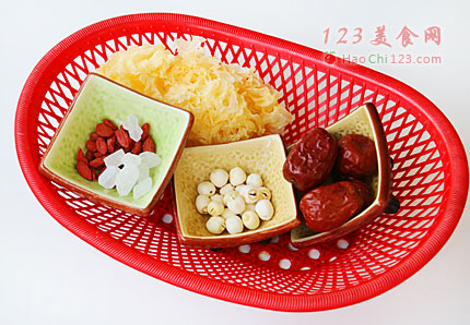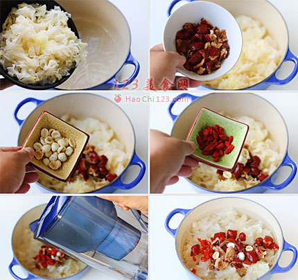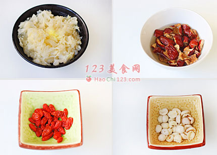 2、银耳用冷水泡发洗净去掉根蒂杂质撕成小朵备用,大枣洗净去核掰成小块,枸杞子泡软洗净、莲子泡软去莲心备用。