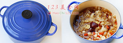 3、选一口合适的炖锅,然后将所有食材加入,然后加入1.5升的过滤水或者矿泉水,因为自来水里含有较多的氯气与杂质会影响成品的口感。